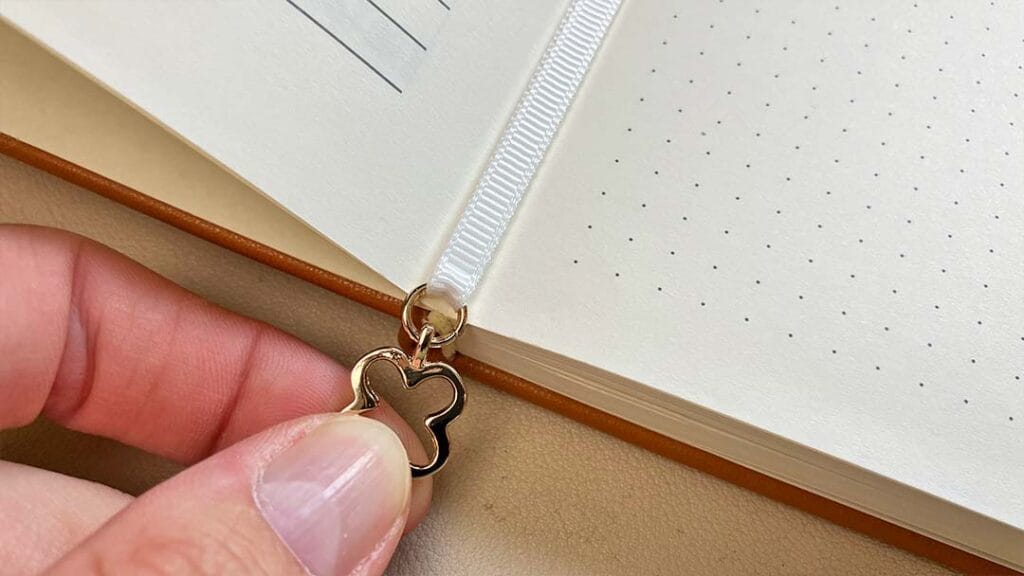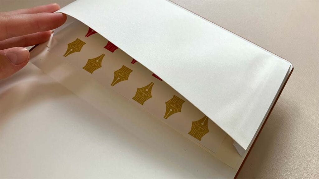 De journal van Esterbrook bevat slechts enkele extra’s. Allereerst een leeslint dat de illusie wekt dat het er twee zijn, maar in werkelijkheid maar één is. Bovendien komt het bedeltje in de vorm van het logo van Esterbrook net niet helemaal tot aan het einde van de pagina’s waardoor je beschadigingen in het papier krijgt. Het vakje in de achterkant van de kaft is wel handig voor het opbergen van platte materialen. Bovendien zit er een cadeautje in: stickers van het logo van Esterbrook in drie verschillende kleuren.