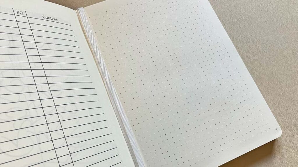 Het zal je waarschijnlijk niet verbazen dat het papier in de Esterbrook journal gericht is op vulpennen. Je krijgt daarom 190 pagina’s (dus 95 vellen) 80 grams crème papier. Het neigt wat naar de gele kant. Alle pagina’s zijn genummerd en gestipt. De stipjes zijn vrij duidelijk aanwezig, wat ik persoonlijk jammer vind. Er zitten ook een aantal extra pagina’s in, zoals de geschiedenis van Esterbrook, het alfabet geschreven door Betty Scoldi en een inhoudsopgave. Niet per se iets wat ik in mijn boekje zou willen, maar ook niet dusdanig storend om het daarom te laten.