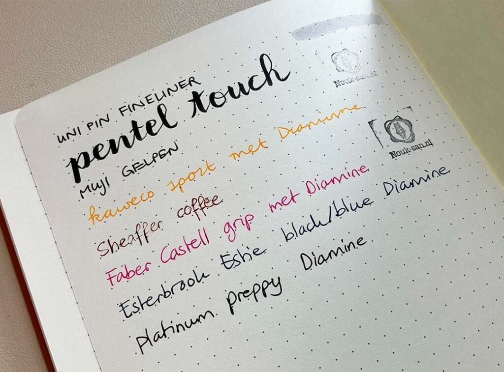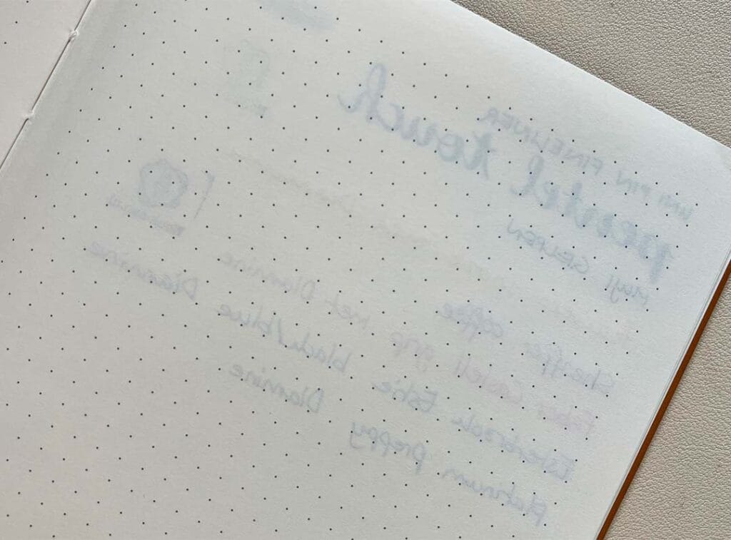 Aangezien de journal van Esterbrook vulpen vriendelijk zou moeten zijn wilde ik dit natuurlijk testen. Daarom heb ik op het papier geschreven met 5 verschillende vulpennen, hoewel de inkten allemaal van Diamine zijn. Het verschilt per pen hoe het schrijft op het papier. Verbazingwekkend genoeg deed de Estie van hetzelfde merk als het notitieboek het niet eens het beste. Ook niet het slechtste trouwens. De overige pennen gingen prima. En hoewel er ghosting is aan de achterkant komt er niks doorheen. Geslaagd dus!