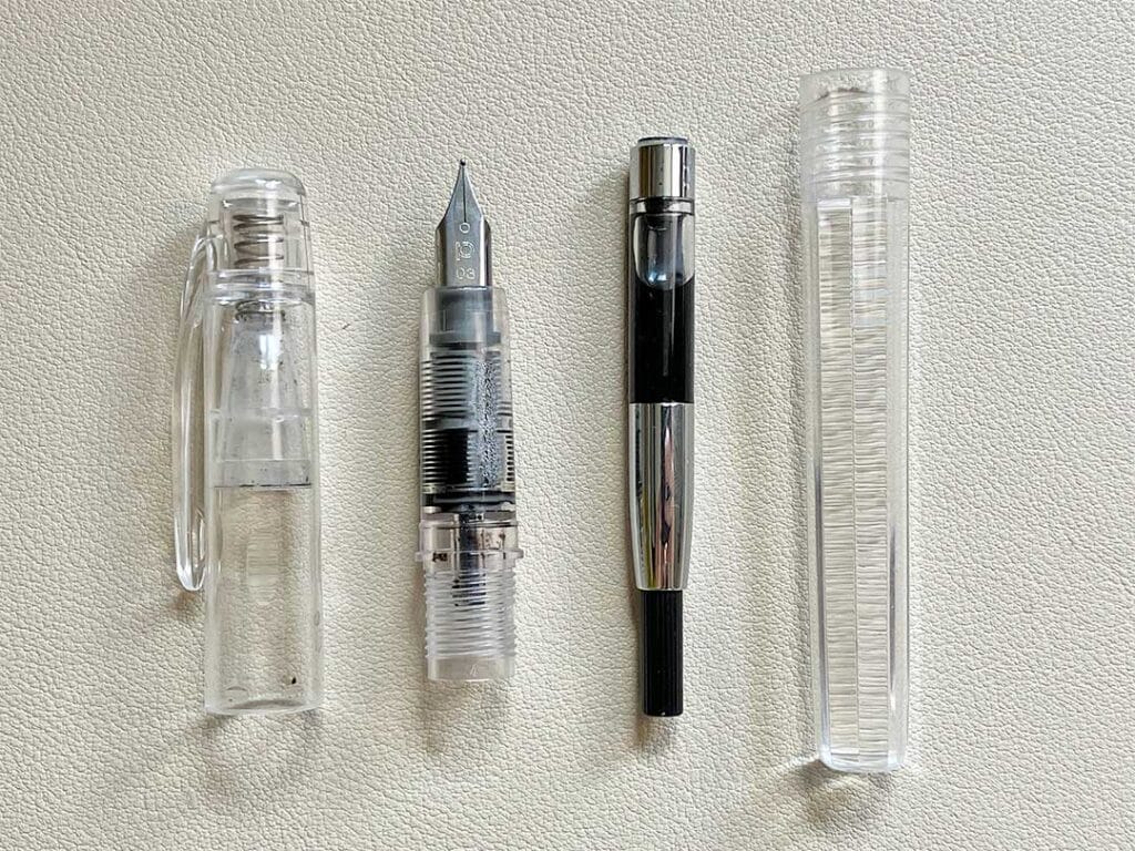 De Platinum Preppy vulpen is gemaakt van doorzichtig plastic met alleen het logo en de naam van de pen erop in het wit. In het geval van mijn pen is dit plastic geheel transparant. Er zijn echter ook gekleurde versies beschikbaar, maar dat vond ik niet zo mooi. Bovendien sprak het idee van de inkt kunnen zien me wel aan, want dat is mogelijk met deze pen. De dop is met een klik vast te zetten op de ronde gripsectie voor je vingers. Dat vind ik erg prettig, want zo kan ik er snel mee schrijven. Ook houd ik de pen op verschillende manieren vast soms, wat een ronde gripsectie ideaal maakt.