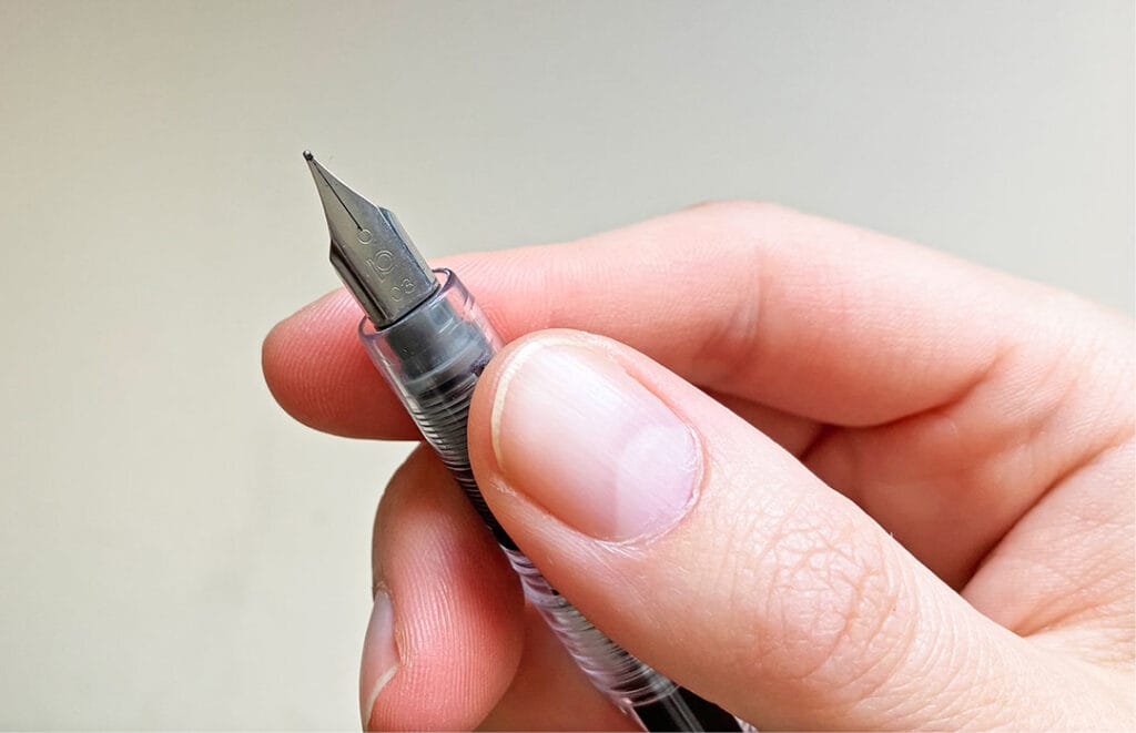 De penpunt van de Platinum Preppy is gemaakt van staal. Dit is materiaal dat vaker wordt gebruikt voor penpunten van vulpennen en het schrijft prima. Ik heb er tot nu toe geen problemen mee ondervonden en ik schrijf er vrijwel dagelijks mee. De Preppy is verkrijgbaar in verschillende diktes, van 0.2 tot 0.5 mm. Degene die ik heb is 0.3, de enige mogelijkheid om een transparante te bemachtigen. Niet dat ik het erg vind, want hij schrijft als een Fine en dat vind ik vaak de prettigste lijndikte.