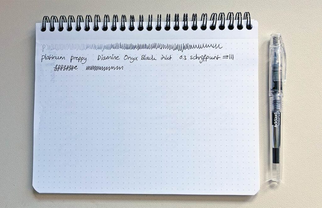 Omdat de Platinum Preppy een vulpen is kun je in principe met iedere inktkleur schrijven. Er zat een cartridge bij die ik nog niet heb gebruikt, want ik kocht een converter zodat ik zelf kan kiezen welke inkt ik wil gebruiken. Dit maakt dat de pen iets duurder wordt, want de converter is duurder dan de vulpen zelf. Voor mij is dit het echter zeker waard, juist omdat ik de pen zoveel gebruik. Tot nu toe heb ik er echter alleen Diamine Onyx Black in gehad en dat bevalt me heel goed.